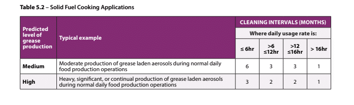 At a minimum Australian Standard AS1851-2012 requires exhaust systems to be inspected and cleaned annually. Best practice however drawn from overseas standards and captured in our best practice guide bases cleaning frequency on the nature, type and hours of cooking.